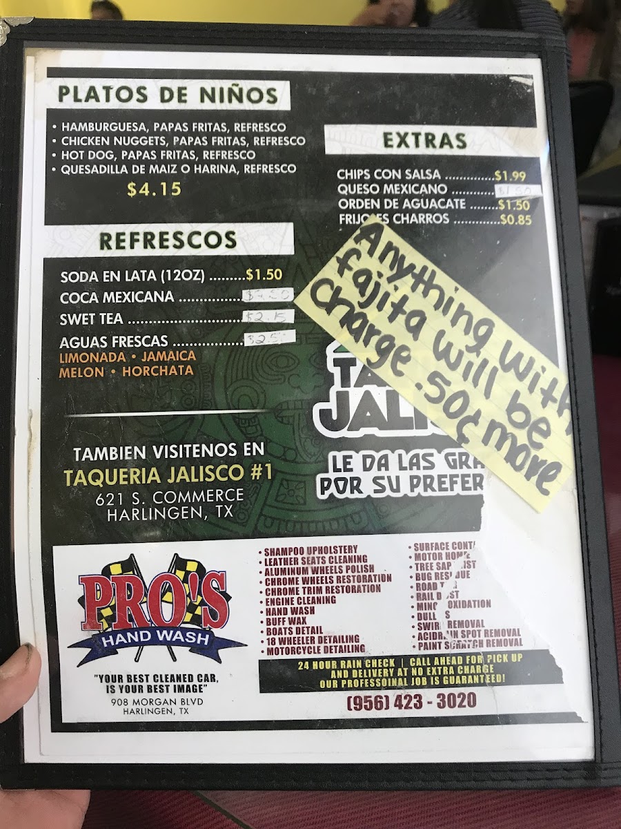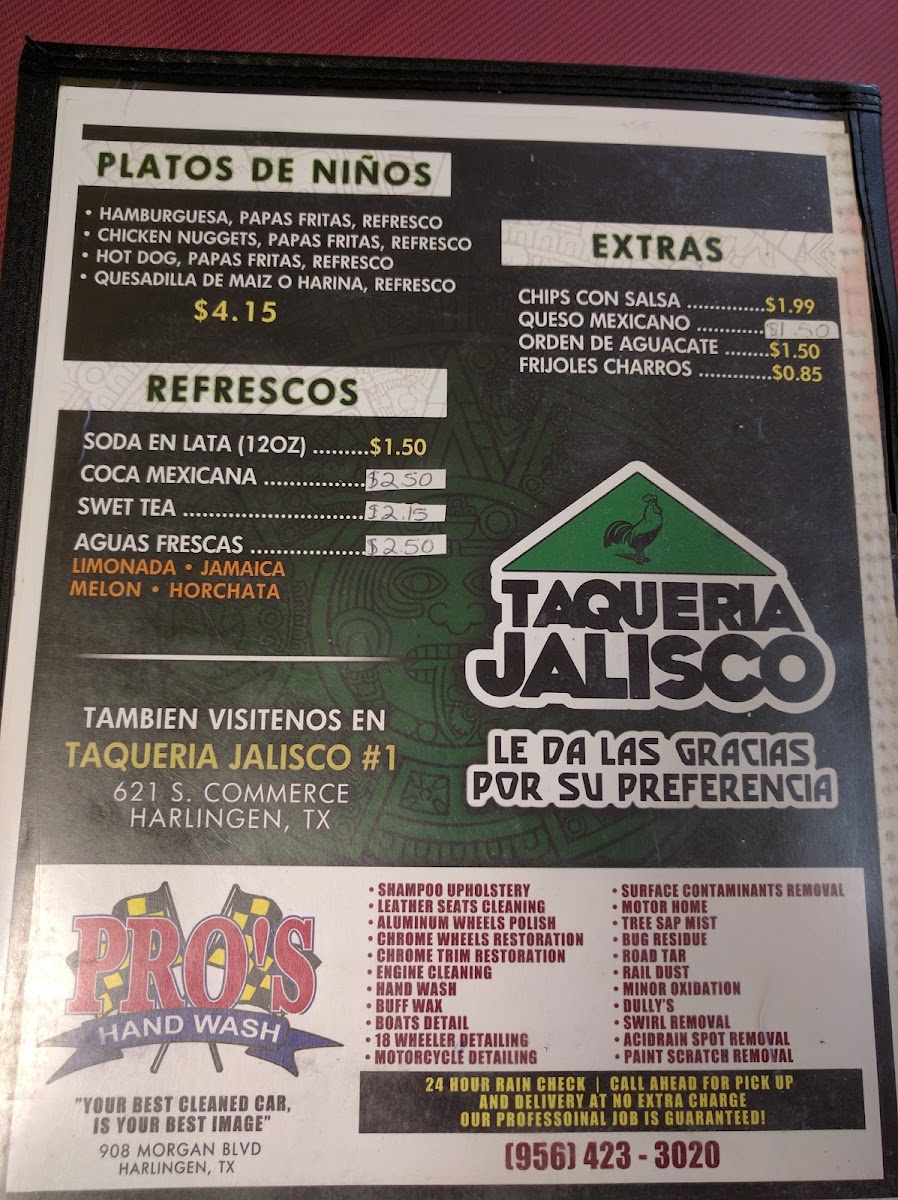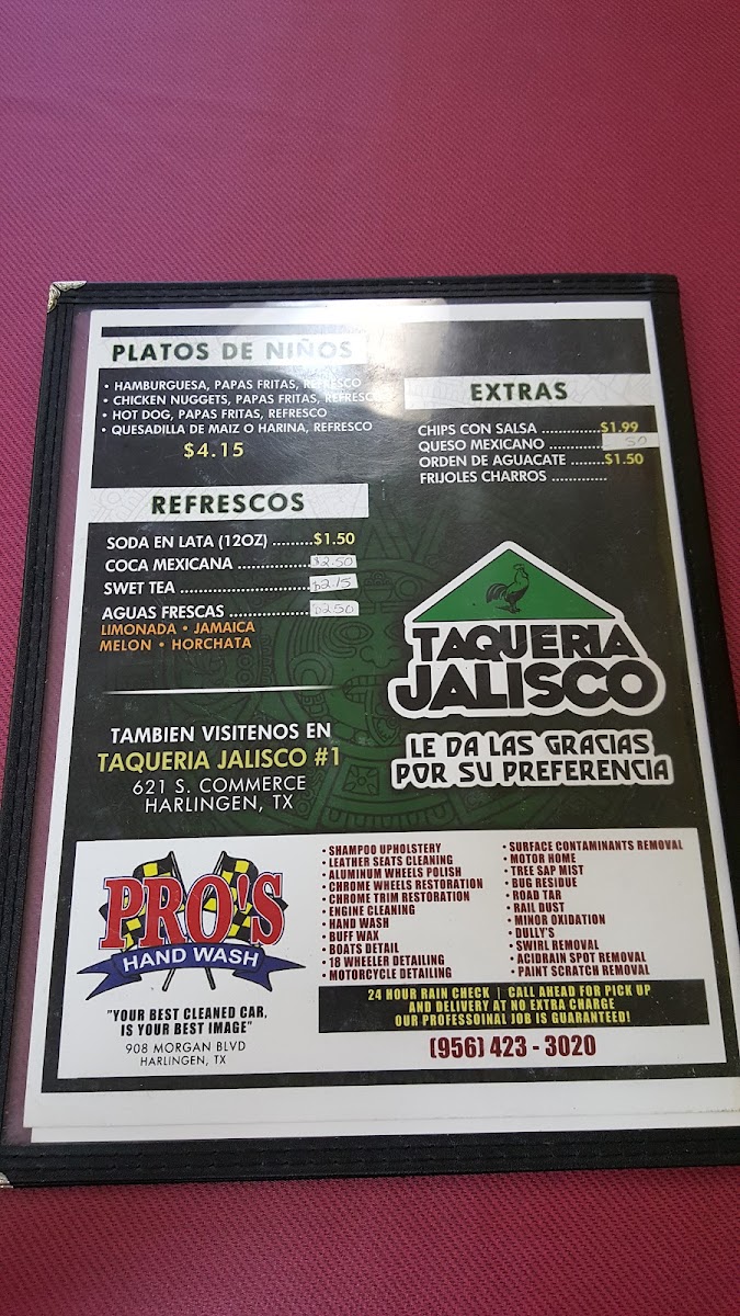 Welcome to Taqueria Jalisco, a hidden gem nestled at 712 N 77 Sunshine Strip, Harlingen, TX. This vibrant taqueria boasts a menu that celebrates the authentic flavors of Mexico. Guests rave about the delicious tacos, with lunch specials and combo meals that offer both quality and value. Reviews from satisfied patrons highlight the freshness of dishes like fajita tacos and lonches, complemented by standout beverages like their refreshing horchata and excellent lemonade.